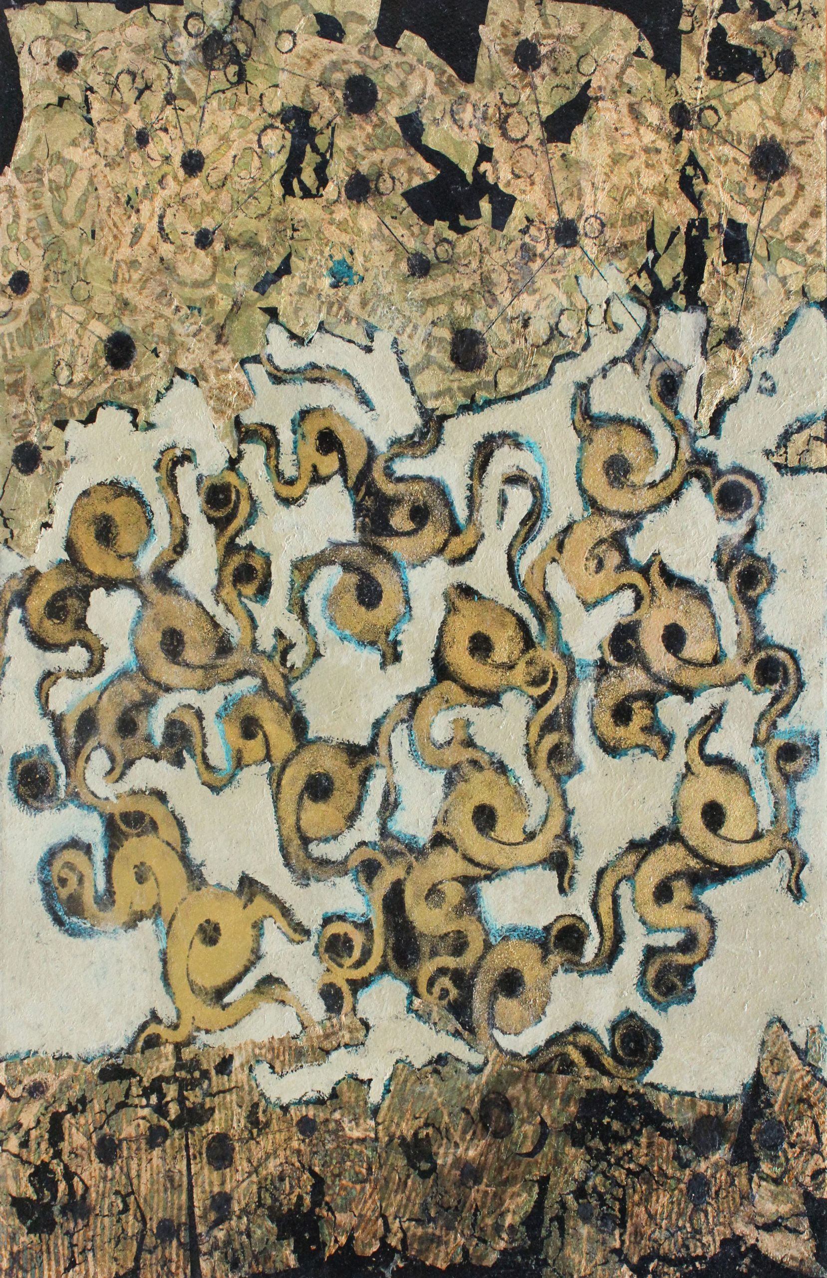 Mixed media, variegated metal leaf on paper